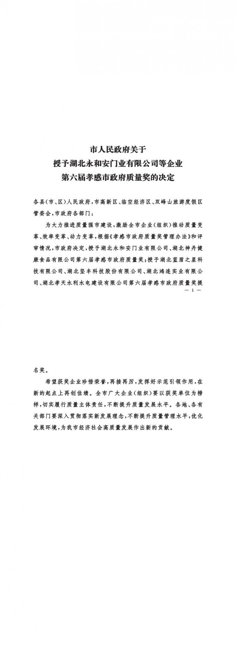 市人民政府關(guān)于授予湖北永和安門業(yè)有限公司等企業(yè)第六屆孝感市政府質(zhì)量獎(jiǎng)的決定